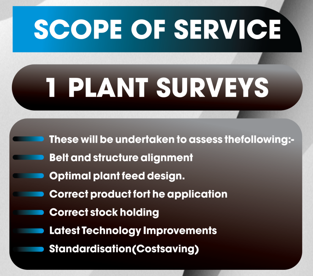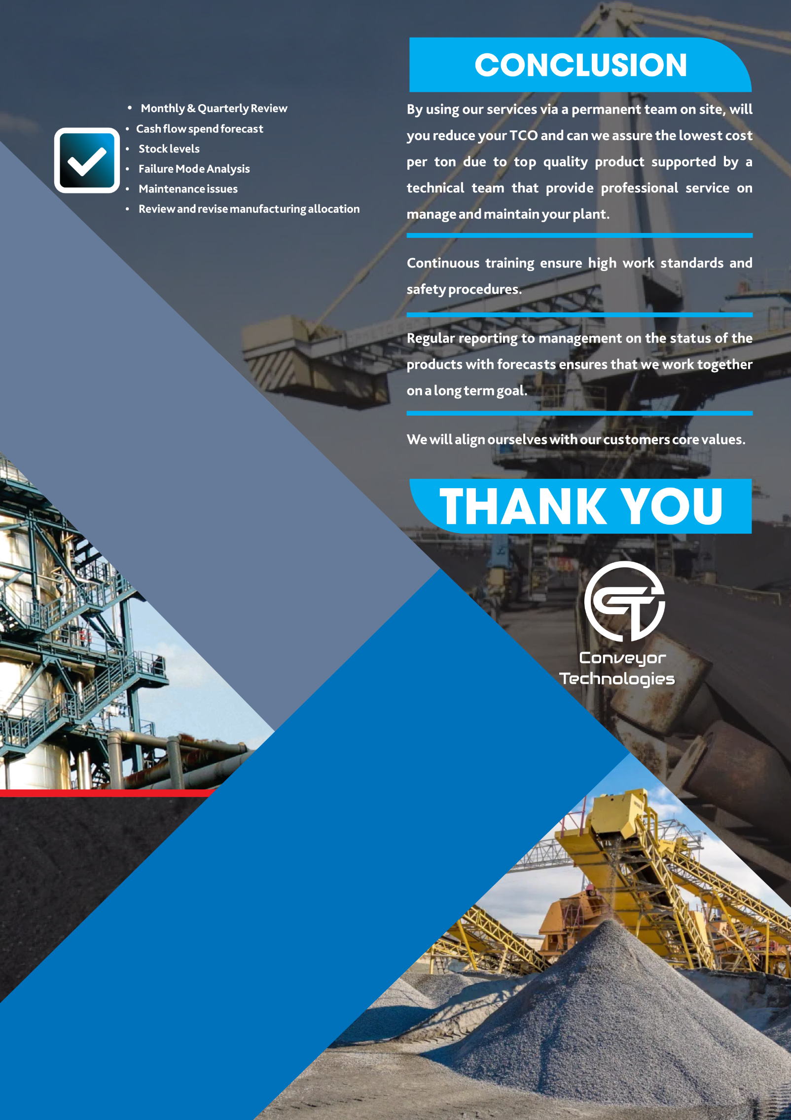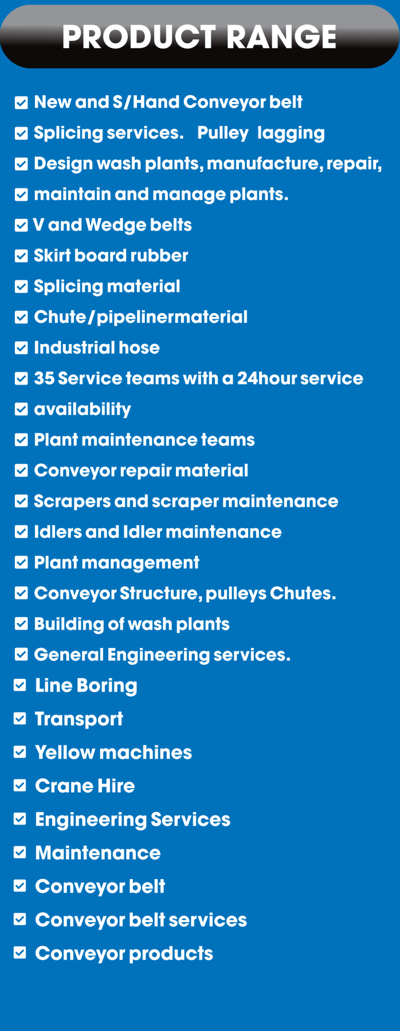 Our service branch in Witbank and Steelpoort offers a 365 team service division with a 24-hour service availability to service and commission conveyor belts.